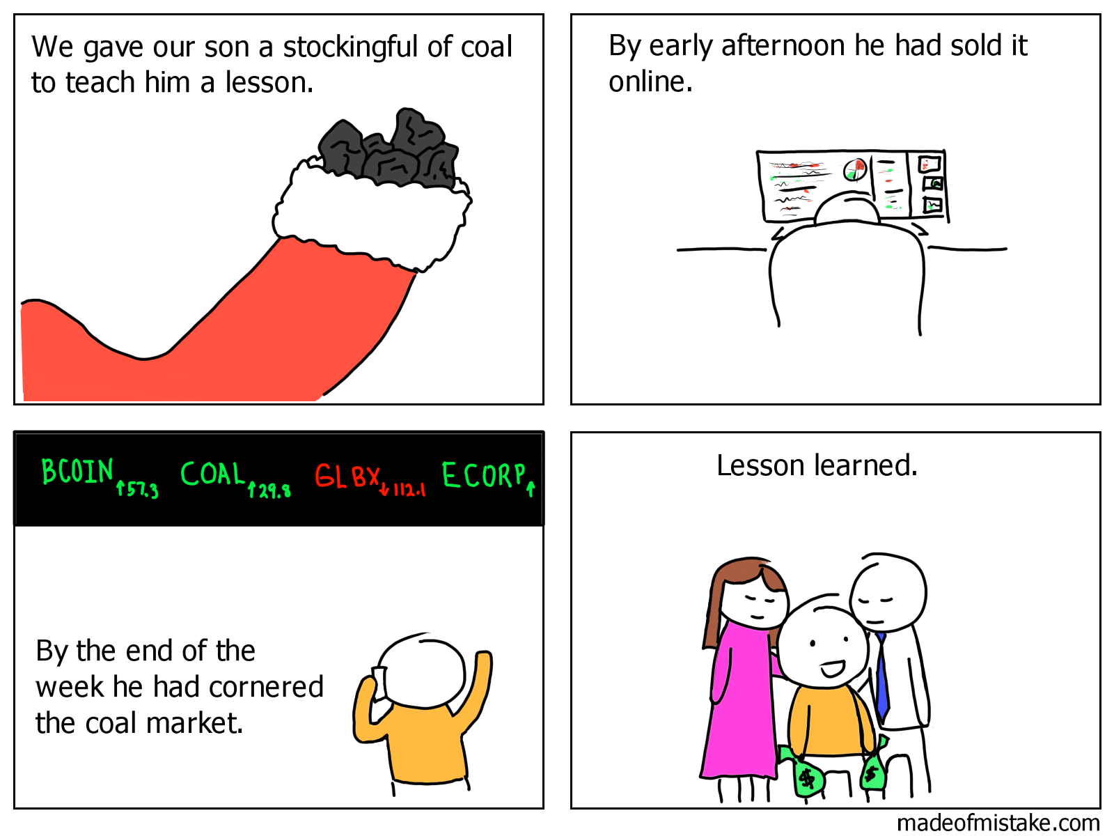 It is a historical curiosity that we have forgotten that in the original tale Santa brought coal for the poor kids to heat their homes and extravagant gifts for the rich children so that they would become even greedier and selfish and then eventually go to Hell.